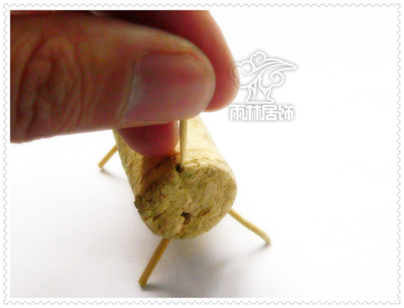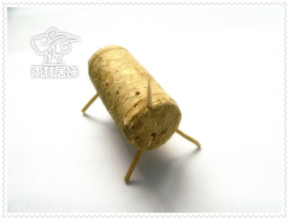 第二步:在其中一个瓶塞上插上四根一样长的牙签,注意角度要有点倾斜,平放时能四根着地,如图:
