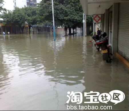 ,经过昨晚下了整整一晚大暴雨后,今天整条路都淹水了,妈妈呀,赶紧CALL齐人码,全家老少(也就我俩跟田爸,呵呵),叫全部员工,全体上阵救灾咯,不然淹到店里来那就损失惨重,我得坐在门口哭了.....真的....经过一场风风火火的救灾行动(把低层架的货堆高起来),人都要累跨了