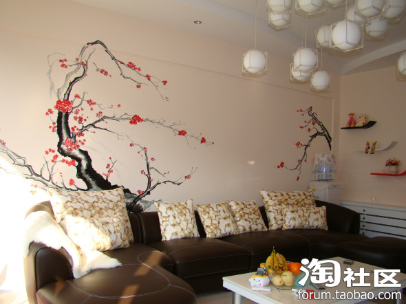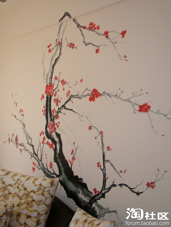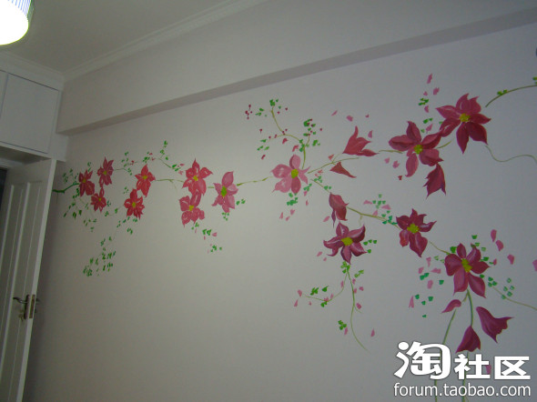 书房一面墙的手绘:当时觉得这面墙太空了,就画了这个紫红色花藤,偶非常喜欢花花,家里几乎到处都是。