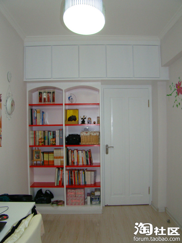 这个书架也是请木工师傅做的,门和上面的吊柜是房子以前就有的,我只变了颜色。