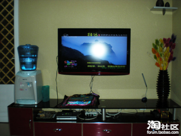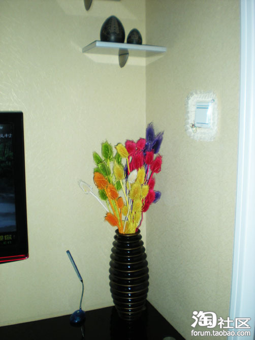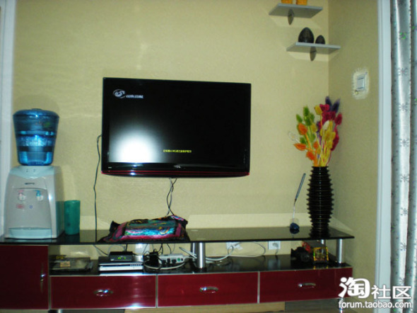电视柜是买来的,一千多,颜色也是配合着主题酒红色搭配的哦!电视盒有点乱了。。。花瓶是几十块钱在卖花店淘来的。放着很搭吧。