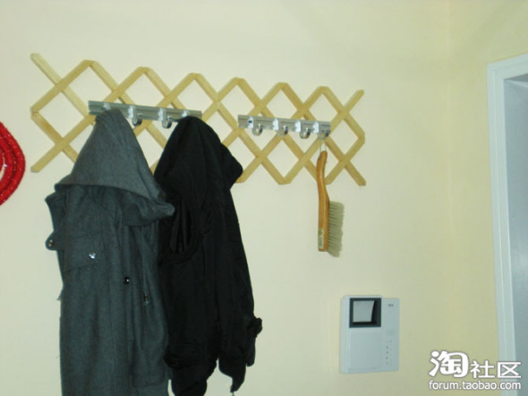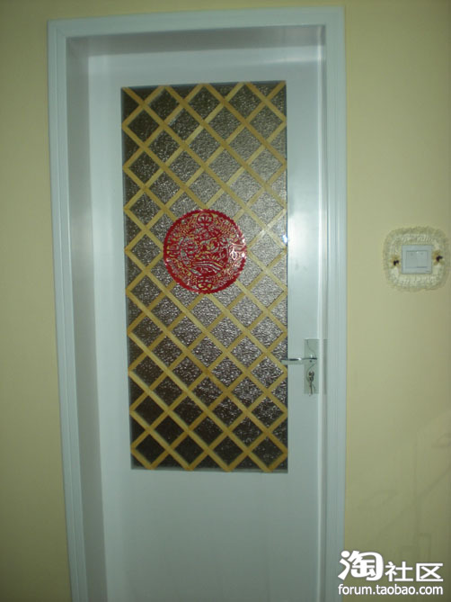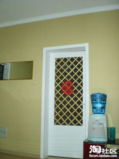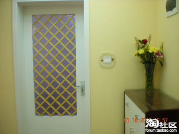 套色工艺门,白色喷漆,清漆木方格,个人很喜欢,做下来代价也不小,但总归满意。想想是不是与门口墙上挂衣服的方格相呼应的呀,呵呵。