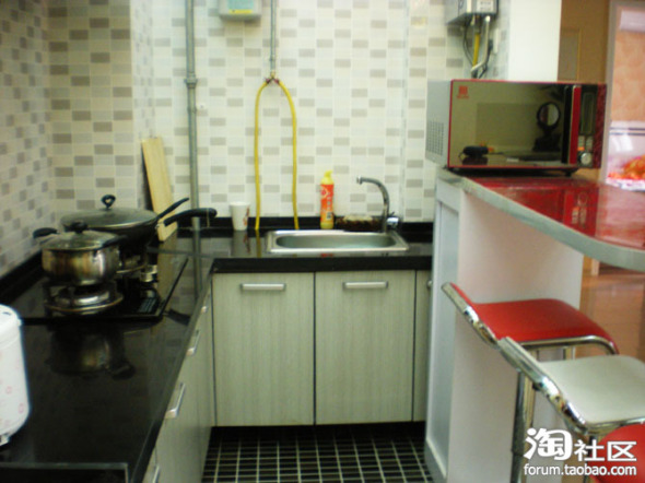 厨房太小,我与老公一致通过,将一面墙打掉,做成明厨房,那面墙的位置定位成个性吧台,在酒吧的氛围里用餐!!又一大亮点哦,我们的大胆创造。。。依然是时简约时尚型。
