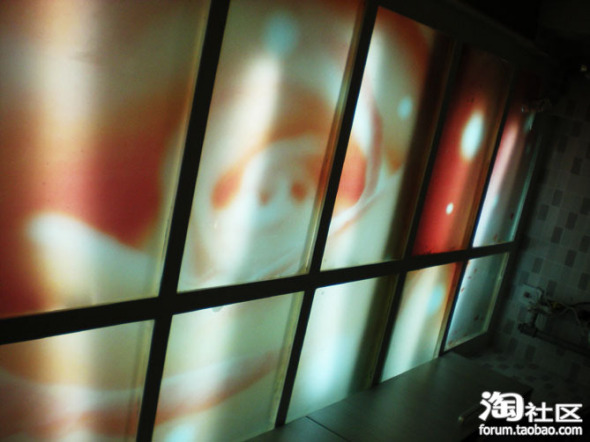 白色木龙骨上面架玻璃,玻璃上面贴大花卉贴,里面安装灯管,这是打开灯光照射效果。。。