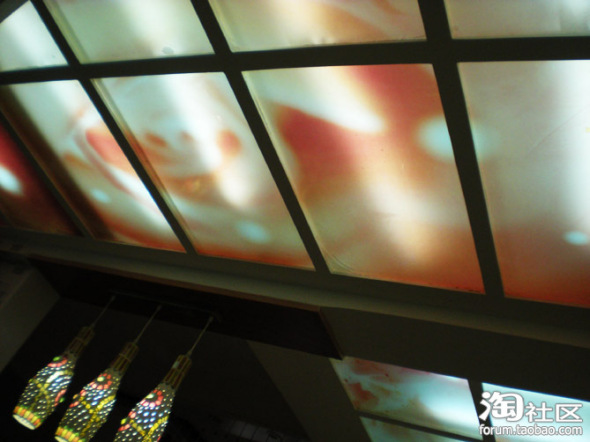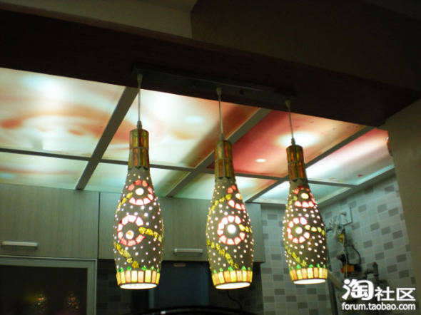吧台灯自选的,琉璃花色,与吊顶也是相得易章哦。很有酒吧气氛吧,吊灯特写哦,还有凹凸感的喔,琉璃花色,缤纷年华呀。。。。。。