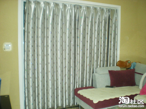 和阳台间隔的地方安了玻璃门,里面装了亮银灰缀亮片的窗帘陪衬着白色油漆的门框,窗帘与沙发底色协调的哦,银灰色的更显稳重大方哦。