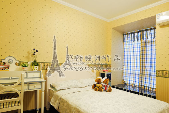 另外一个美式乡村风格的卧室,这个房间的特点是家具全是打的,床是个塌塌米,床的方块架是打的