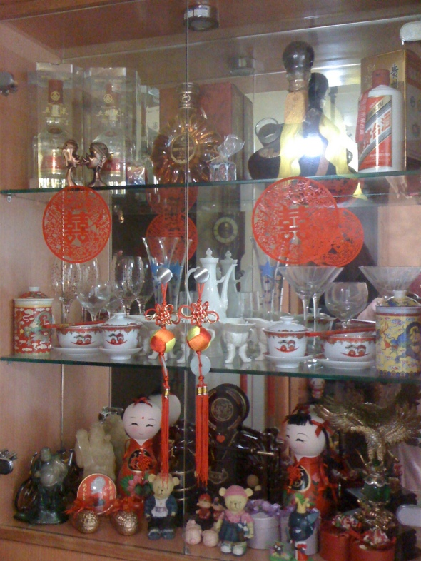 装满杂七杂八东西的酒柜,大多数都是淘宝网上淘来的东东
