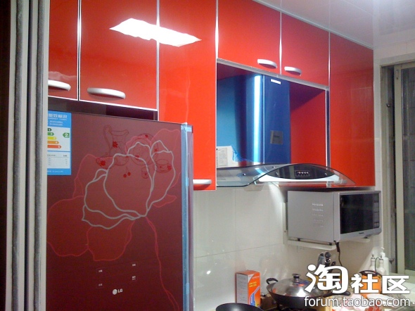 厨房:选用红色的LG三门冰箱搭配红色的厨柜