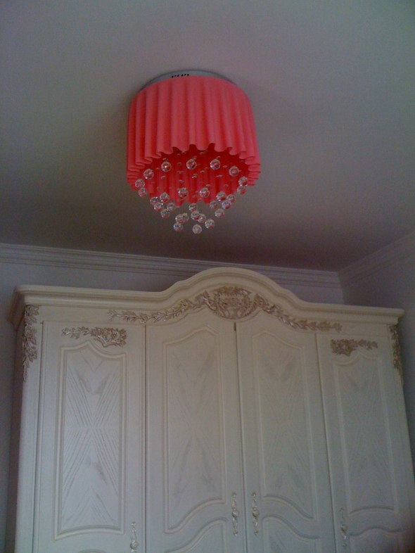 主卧:粉色的水晶吊灯和白色的欧式家具