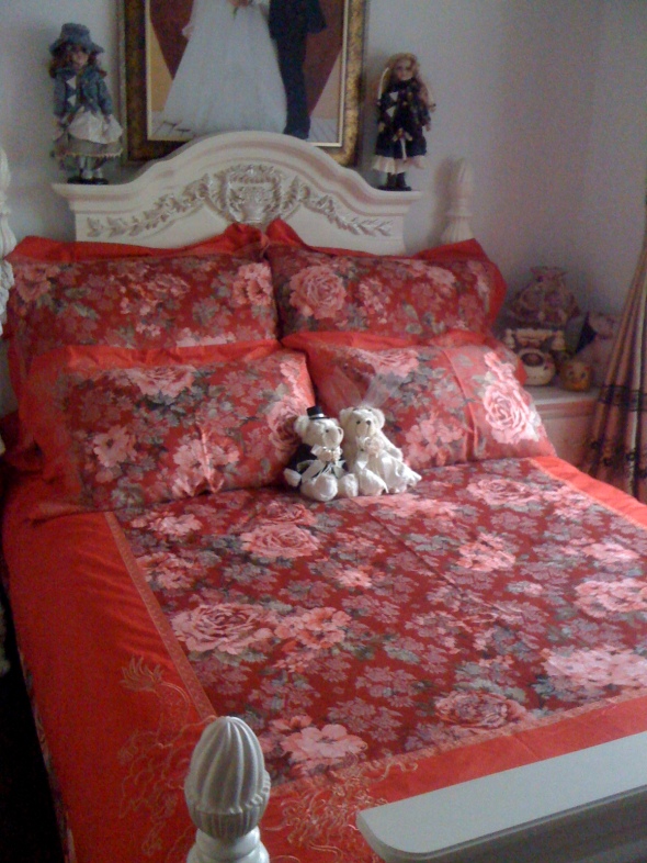 主卧的大床和超喜欢的富安娜床套,床上的一对熊也是淘宝网上淘来的