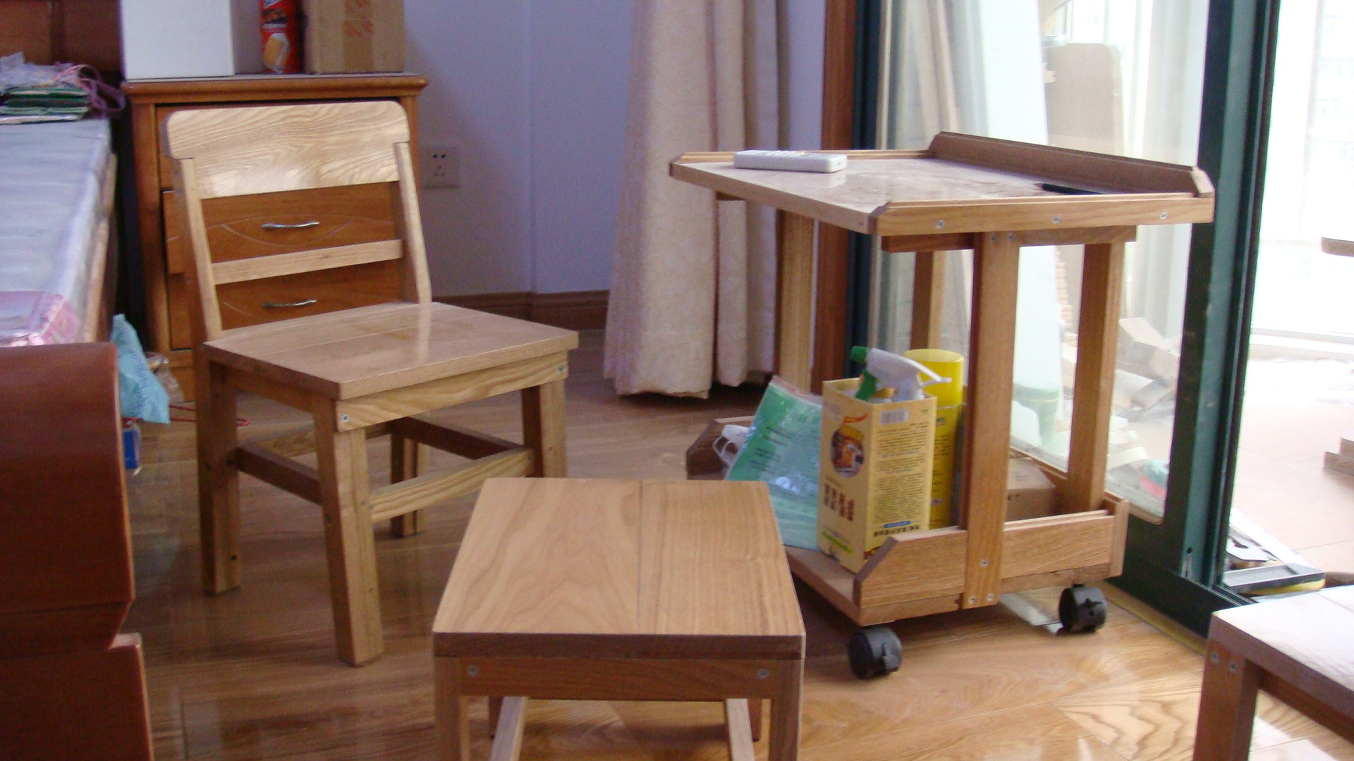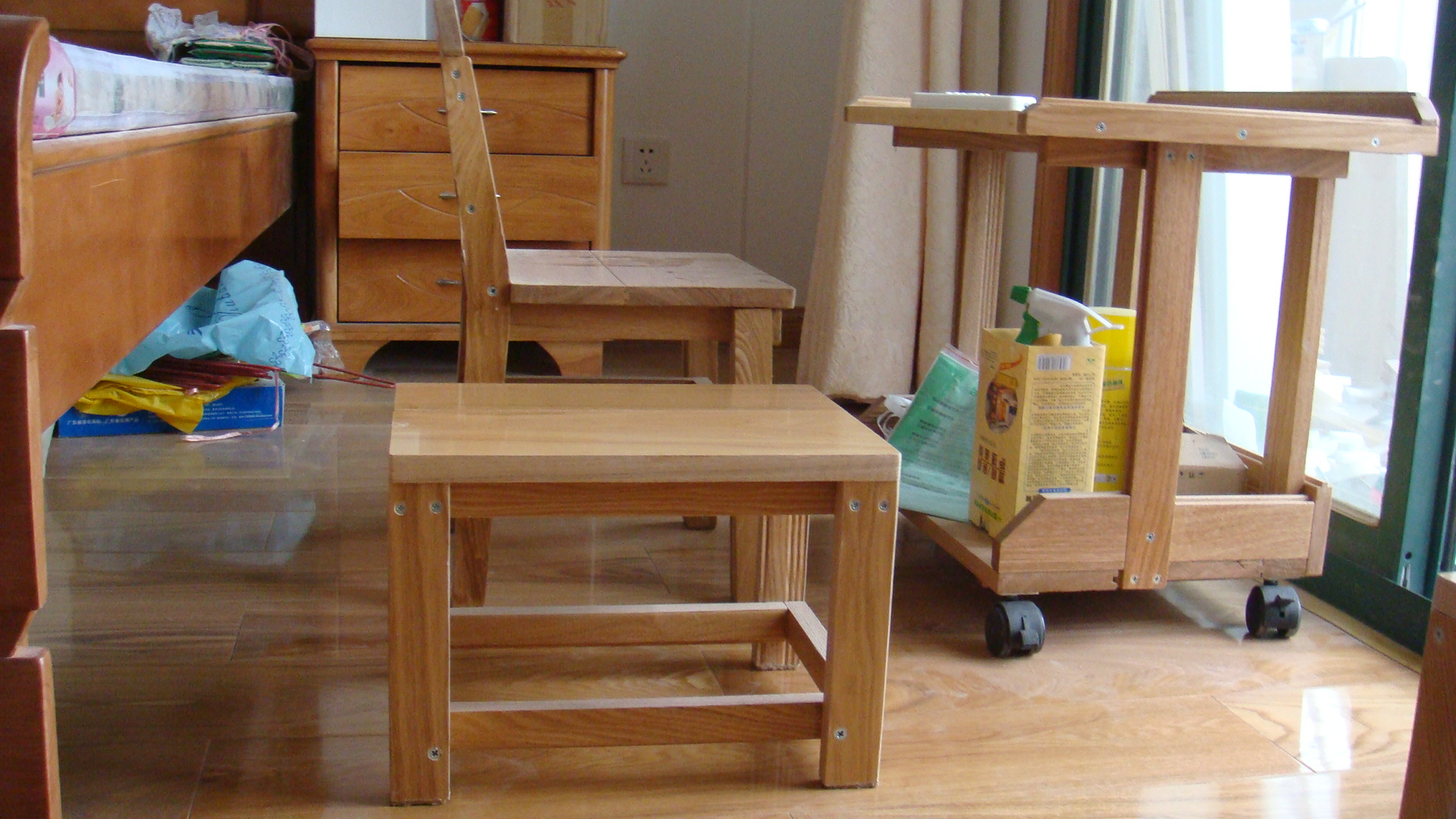 这是家里实木地板用剩下的,剩下了很多半截或者不太长的段段,不能拿来继续铺了,老爸就改造了一下,用略微长的段段,自己设计桌子和椅子、凳子的图纸,重新锯啊订的,做了几个很结实的小家具哦~~~