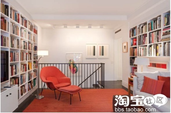 书籍按照体裁分类,摆放在二层的起居室兼书房里。