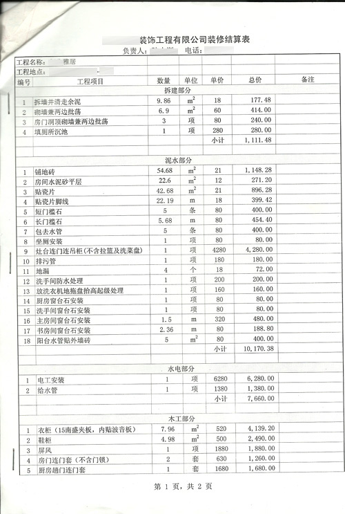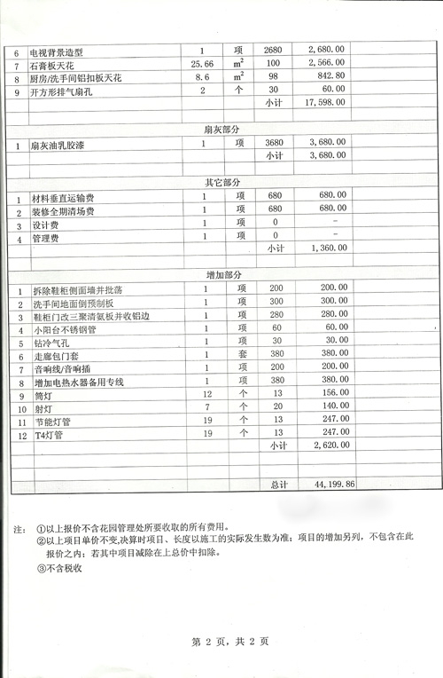 下面是当年的硬装的那份报价表,总金额预算是44199.86,但在最后收楼的时候还是超预算了近6000。有兴趣的你可以参考一下。