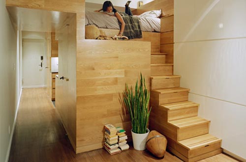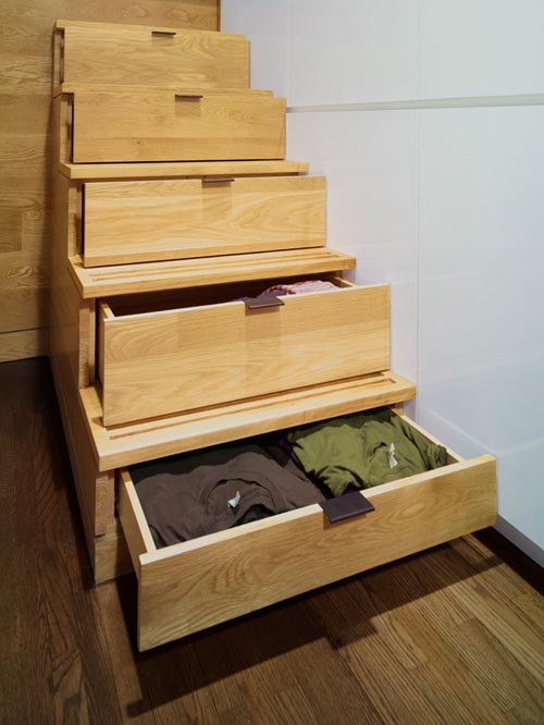 对于蜗居族来说,这样的楼梯抽屉着实能让人产生惊喜。木质楼梯的每一阶层可以像抽屉一样拉开,从而利用里面的空间收纳衣服,书本等物件。这样,空间不仅得到充分利用,整个房间里面也看起来更加干净整洁。