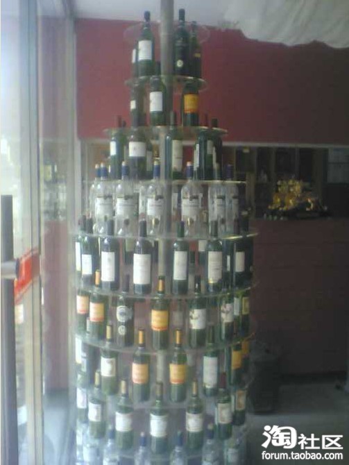 几个不同大小形状的圆盘淘出一个个瓶身粗细的洞,瓶子往里一放,搁在一起,酒瓶“金字塔”也没用多少人民群众的智慧与汗水,就屿立在了世界民族之林的中国大地上了。