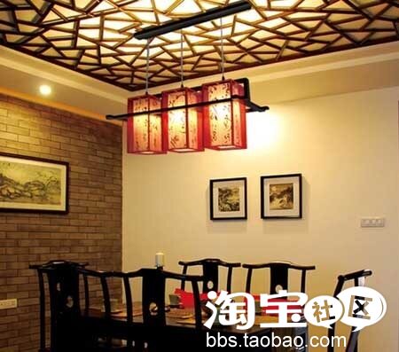 古香古色的餐桌、餐椅,加上黑色实木边框三头红色拉丝仿羊皮餐厅吊灯,配合实木镂空天花板的装饰散发出浓浓的中式风格意蕴。