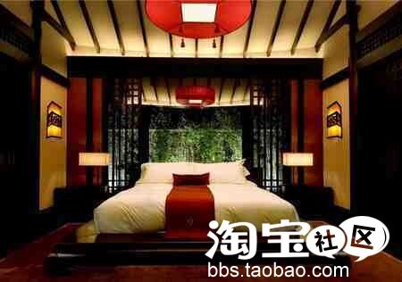 中式红木大床的左右,搭配的是最经典的中式仿羊皮壁灯。让人仿佛置身于古代皇宫。