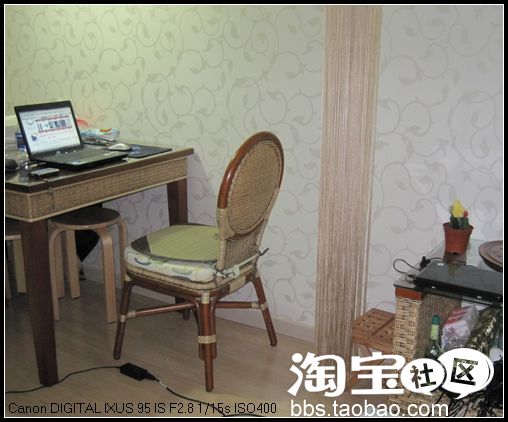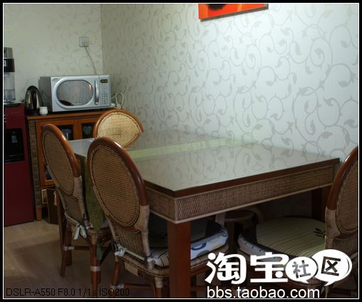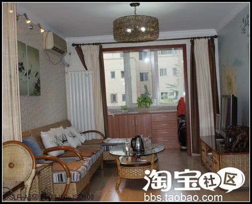 【户主】: pansutanmr 【适合居住人群】:三口之家 (一)客厅篇: 儿子的相机我不太会用,北京最近一直阴天,照出的效果总是不好,等有好的PP换一下,呵呵 从餐厅看客厅 从客厅看餐厅 我家经常高朋满坐,所以餐桌买了个能伸缩的,拉开后有1.9米长,吼吼 客厅藤制家具除了茶几是藤王府的,其它均为艺藤居的,藤制家具因是纯手工制品,感觉比实木家具还贵,椅子1千一把,所以只配了四把。小小的餐边柜标价4000,我买的样品,6折拿下的,呵呵。 客厅和餐厅用线帘软隔了一下,呵呵 电视背景墙,这个壁画怪怪的,貌似临摹国画,可荷叶有实景拍摄的感觉, 壁画只能看着小样选不太容易 ,呵呵 沙发背景,选自淘宝,与电视背景一明一暗,是不相得益彰? 沙发靠垫,淘自淘宝,很COOL吧? http://huaili.taobao.com/search-cat-36366564-205391122-NDUmdGltZXM7NDXA5cPX.htm?checkedRange=true 餐桌背景与灯,仔细看,碗当表盘哟~ 来自淘宝 http://jazzy-art.taobao.com/ 阳台一角 入门的穿衣镜,显得空间更大一些,呵呵 入门的多用板,很实用的说,呵呵。 饮水机在淘宝上淘的,比商场至少便宜50%,http://store.taobao.com/shop/view_shop-8fa2a6cd7574548aff7d8692c6ea78ec.htm 我觉得壁纸的选择不太成功,当时看小样选的,感觉这个图案跟藤制家具挺搭的,大面积的铺上后,又觉得这款更适合搭欧式风格家具,另外花型对于客厅来讲有点碎。有的淘友认为太繁锁,可能闪光灯闪的反光,实际上还好,我觉得客厅总体感觉还是挺清爽的,呵呵。 (二)旧房改造前样子和周边环境 这是一套十三年前单位分的福利房,套内面积只有53平,据说当年单位是按建筑面积86平买下的,啧啧,瞧这公摊摊的~,不过房改时按73平卖给员工的。这是一幢12层的高板,每两层共用一个长长的连廊,这楼除了公摊大其它还挺好的,质量好、户型设计的不错,我一直称我家为经典小户型,没有一点点浪费的面积,呵呵。 楼道长长的连廊,楼道虽然没有装修,但很干净,从来没人乱堆杂物 这是客厅装修前的样子,从墙裙从看出10多年前的装修风格,呵呵 北边与我家一路之隔的是北京轨道交通运营指挥中心,每天早上大门两道岗,戒备森严的样子~ 南边楼下有个儿童乐园,与儿童乐园一墙之隔的是中华女子学院,再南边是芳草地小学二部,总的来讲居住环境不错,这个小区在当年是北京的示范小区,目前房源也挺抢手,老小区就是车位比较紧张。 装修之前在装修风格方面煞费苦心,尤其是家具的选择,以前不喜欢中式家具的厚重、欧式家具的奢华,喜欢简简单单的板式家具,可随着年龄的增长会发生变化,现在非常喜欢中式家具,逛了很多家具市场都没选到如意的,中式家具尺寸都偏大,不适合我的小窝,后来客厅选择了藤制家具,藤制家具是不用贴绿色标签的绿色家具,虽然不是特显档次,但是有回归自然、淳朴、休闲的感觉。