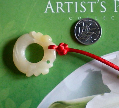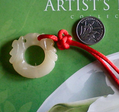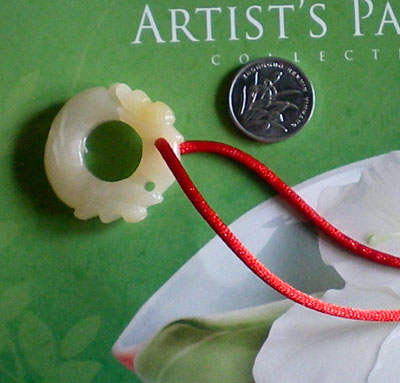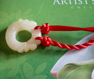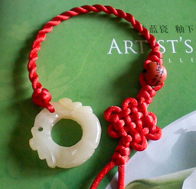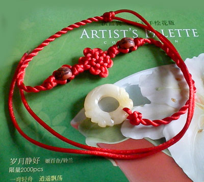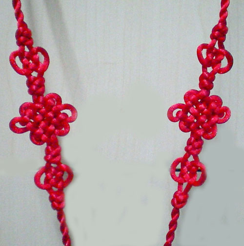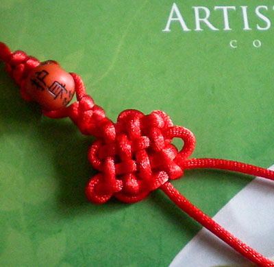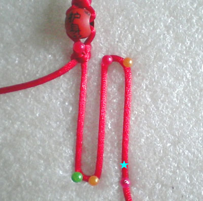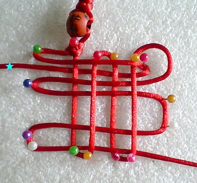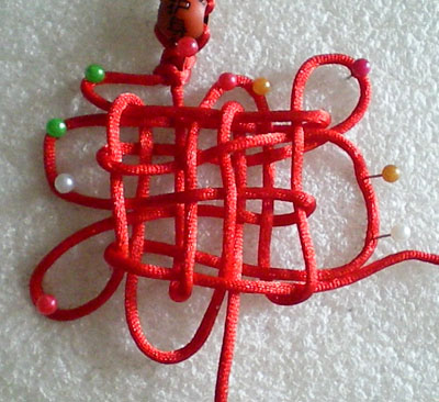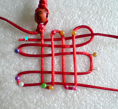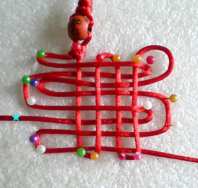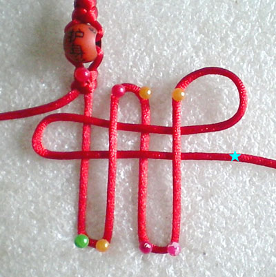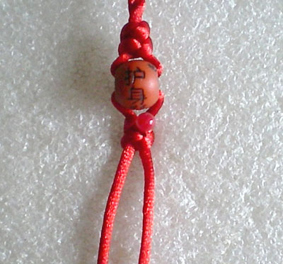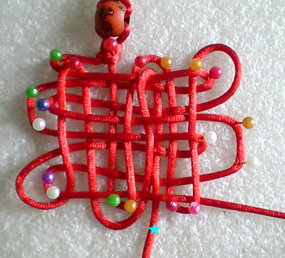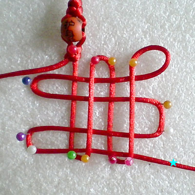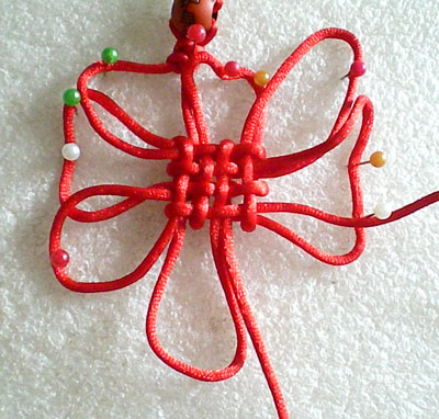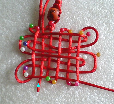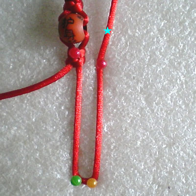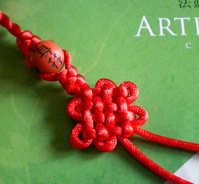 好!我们已经完成此挂饰的1/4 下面我们再编结另外一根红绳!方法同上面是完全一样的!将另外一根红绳穿入旁边另一个孔内,按照上面的编结方法直到编完!