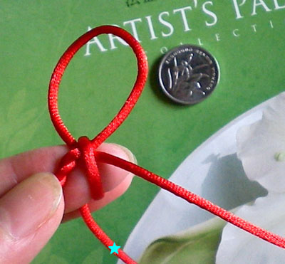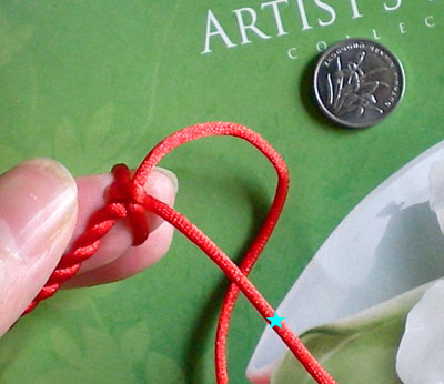 我们将绳搓一下形成麻花状,大约在3.5寸的地方,我们编两个金刚结,绿色星星代表正在运行中的线