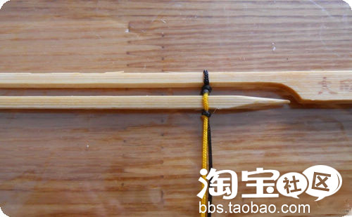 接下来,我们开始进行纺织,先按下方将竹签摆好,取出绳子,最简单的方法就是直接套竹签上打结,如果会中国结的编法,可以加一些花样噢