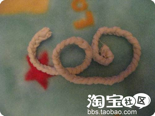绑出辫子后,将辫子按照下图的圈法圈起来,然后用针线把圈与圈之间固定。(这个只要能固定圈圈不散,你要怎么缝都行的,我是打十字缝,不要叫布条散开就OK了。)