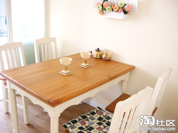 开始餐厅~~~同样是网购的一套,价格很便宜~~这家做地中海家具的质量控制得很奇怪,餐桌椅很不错,各种柜类、抽屉之类做的一般一般。后来买了南方一家网店的书柜,才知道差距之大!!教训啊教训,以后买家具,一定要找南方工厂做!!