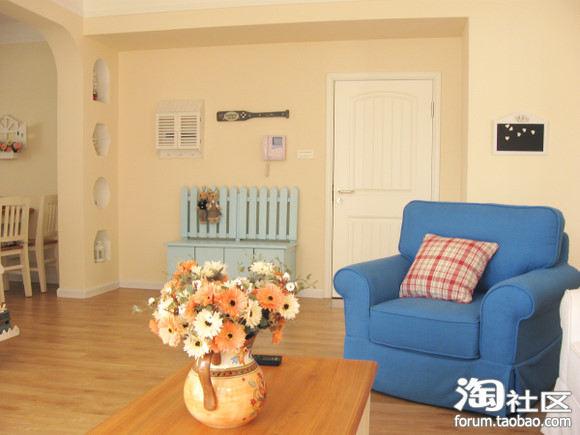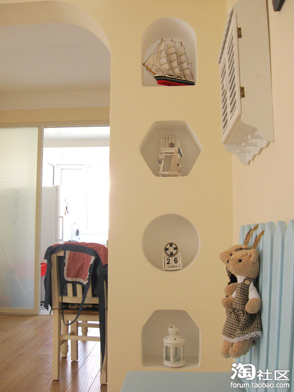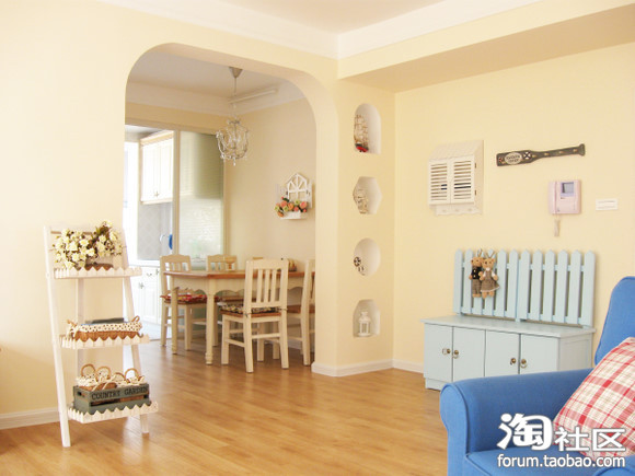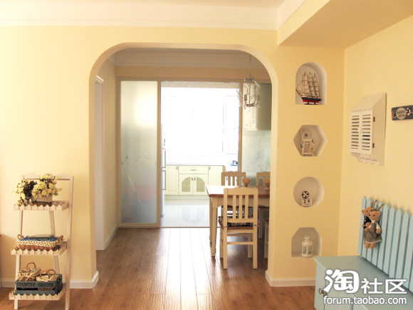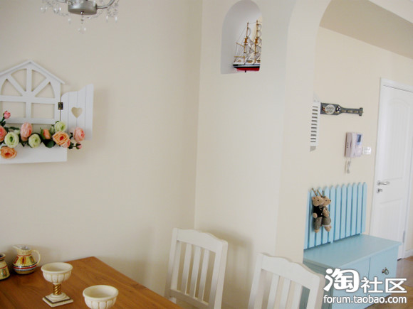 地中海田园乡村风格一直是我的最爱。白墙,木顶,砖地,花木,蓝色马赛克,彩条布艺,拱形圆窗……但是因为条件有限和某人的“狠狠”阻挠,并未完全达到目的……所幸因为我的坚持,保留了一些地中海的意思在里面。然而意味完全不同了。