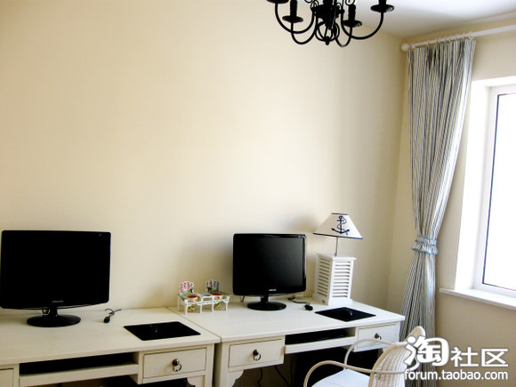 这窗帘是实体店购的,和罗马杆的钩正好配合。亚麻的蓝白绿条纹,不是很沉。但是在小空间里很有韵味。