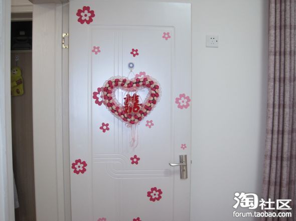 接下来是主卧,很小,衣柜都没办法放,只能放一张床。门上的贴纸也是剩下的。结婚买的玫瑰心,呵呵,很喜欢哟··