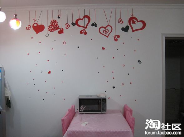 进门左手是一块白白的墙,不知道怎么处理,就贴上了一对可爱的猫咪,家里的墙贴都是TB上淘来的···