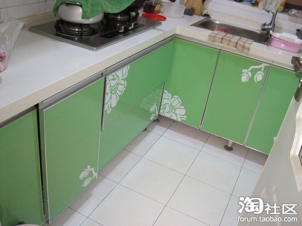 我的袖珍厨房,个人很爱做饭,所以东西都买的很齐全。原先橱柜颜色是公公选的,绿色,个人不是很爱,就买了白色花贴上去,发现也不赖嘛