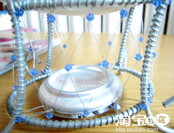 我买来了一些8MM粗的铁丝和一些细铁丝和钢丝,我用8MM的粗铁分别剪成了六段(铁丝太粗剪时把我的手都勒红了),分别弯成两个大小不一的椭圆型,四个两头像云卷的型状(做灯座的腿),然后把它们组合起来用细铁丝固定住(小椭圆在上面),一个灯座的框架就出来了,但是还不稳定,我又用细钢丝像织鱼网似的固定在灯座的框架上(这样就稳定多了),在上面我还镶嵌一些施华洛世奇的水晶珠(为了美观投资有点大),呵呵!外型基本完成了,想想还缺什么?
