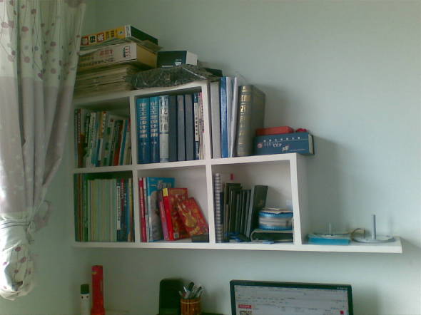 小卧室的电脑桌和书架,总体很花啊,有点浪费感情啊!不过还好啊,自己知道很好看就行了,,LG是个爱学习的人,看书架上厚厚的书啊!