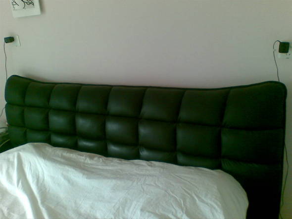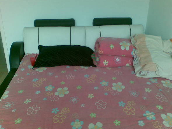这是小卧室的床,床头是牛皮的,我手机像素不行,效果全没出来,不过很好看,连同床垫,床头柜一起才2980米,很实惠吧,哈哈