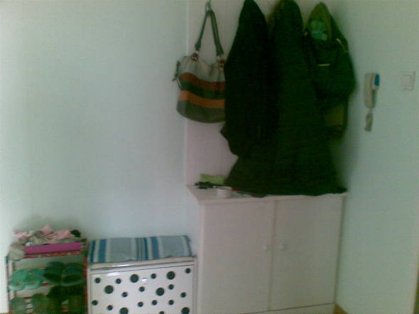 这是圆圈的对面,挂衣服的地方,还有换鞋凳,鞋凳本来是纯白色的,是在淘宝上买的,买回来自己安装的。可是LG在安的时候螺丝上的太厉害,使得外面的漆皮有点爆了,没办法,我就买来贴纸自己改动了一下,还好吧,和对面的三个白色的圆圈正好呼应一下啦。