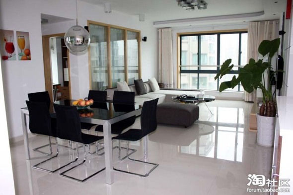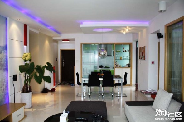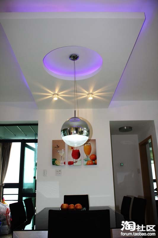 这是进门后看到的客厅餐厅全貌,餐桌餐椅、沙发、茶几及所有看得到的灯都是网购的(尤其是灯,我可是在网上挑选了很长时间)。