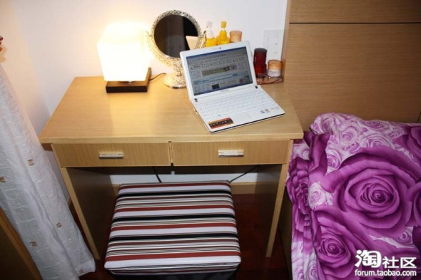 床、床头桌、床头柜包括走入式衣柜都是自己画图纸让木工做的,桌上的冰块灯、安娜苏镜子、三星上网本和地上的收纳凳也都是网购的。