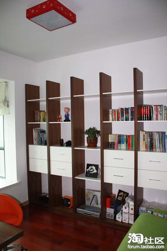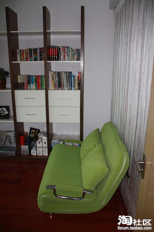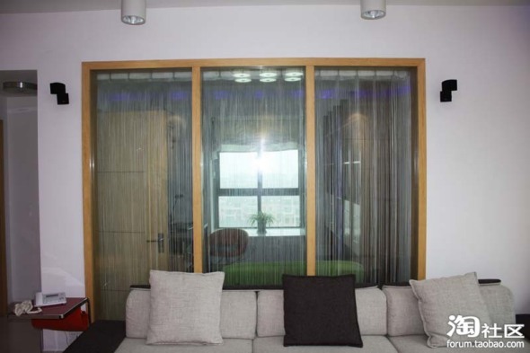 书房就在客厅沙发的背后,隔着三块玻璃,这三块玻璃现在只装了网购的线帘(只要35元),下一步还想自己设计图片定做三幅写真照片卷帘画装在里面(网店已经看好了)。