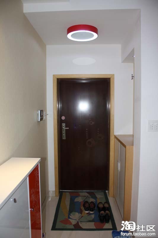 门厅的灯是个中间带镜子的红色圆镜灯,我想取其两种涵义:一是鸿(红)运当头,二是照妖驱魔。