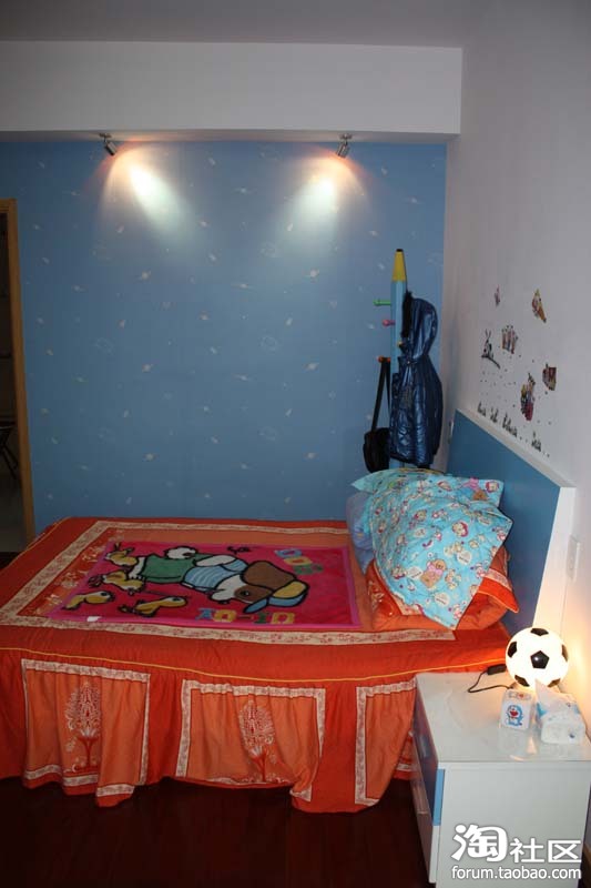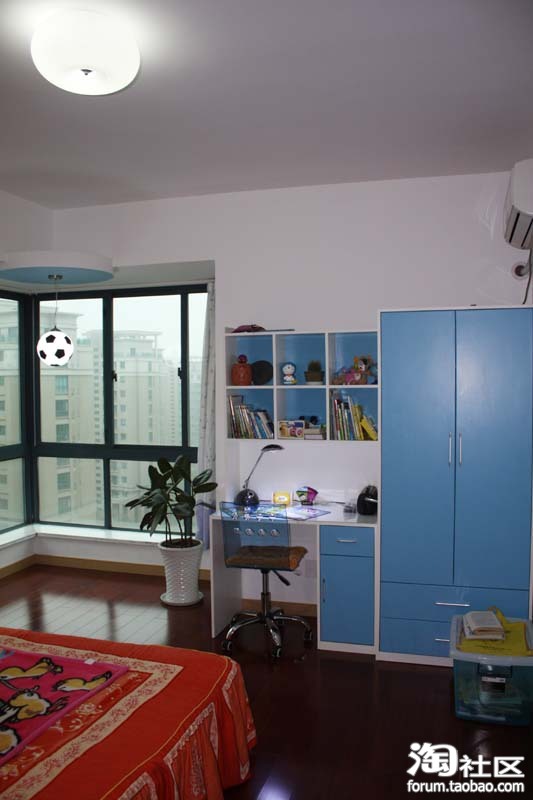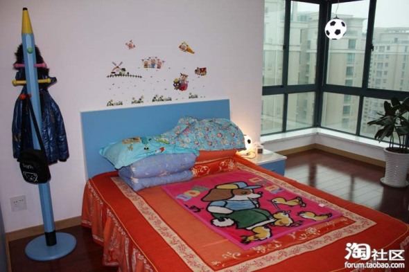 次卧里的家具除了这个铅笔衣架外,都是自己画图纸木工做的。因为是儿子,所以儿童房选择了蓝色为主色调。