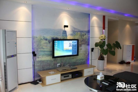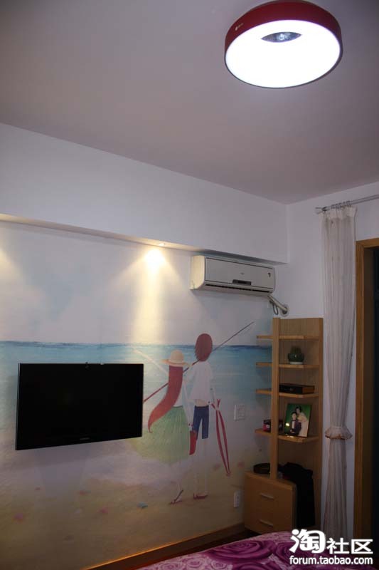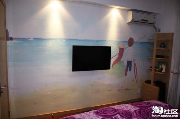 电视背景墙用的是整块无纺布壁纸,主卧里还有一块,两块共1800元,商家的图样很多,自己也可提供,我是用PHOTOSHOP加入了隐藏儿子笑脸的山水画。(没想到这个跌价快,现在都跌了一半多了,呜呜——另外还有一个缺点,会褪色,所以要用颜色偏深的图片,避免像我的图片一样变得太淡了。)