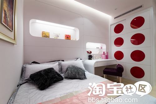 次卧收纳柜面同样以红色圆圈造型突显出普普风的主题,亮丽的顏色让空间活泼年轻了起来,墙面空出扁方的置物空间,在灯光照射上更显摆饰的珍贵感。