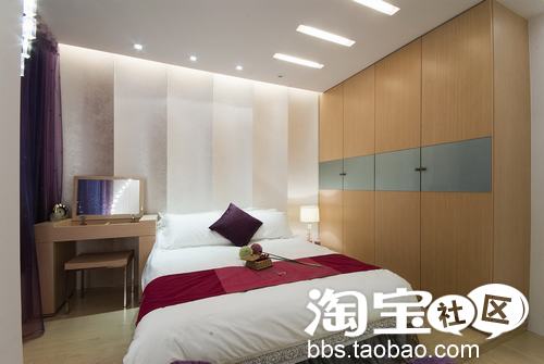主卧室以紫色调性表现出浪漫华丽的质感,床头先用木作作出波浪造型面板,再以白色油漆喷烤,墙面变得特别抢眼。