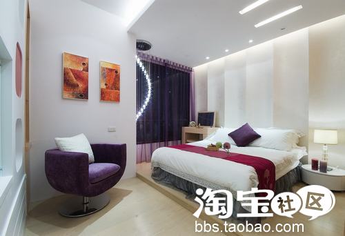 搭配浪漫的紫色窗纱和单椅,强调出女性时尚感;架高的地板区隔出睡眠区及起居空间,动线顺畅。