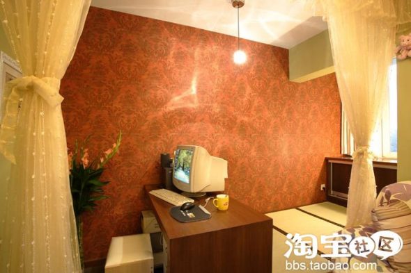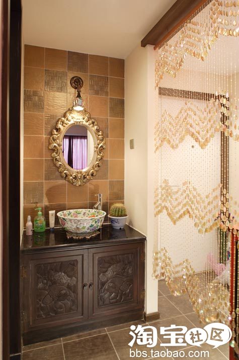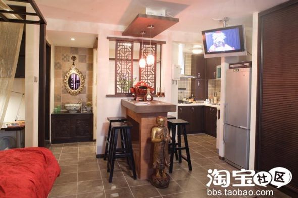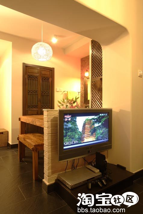 其实这种想法也不尽然,设计师在这个户型的处理上,就结合了业主的要求,巧妙的把一些东南亚装饰风格元素,完美的融进了这个小户型:普遍使用的柚木色使空间显得非常舒适而别具特色,局部的植物壁纸也给空间增色不少