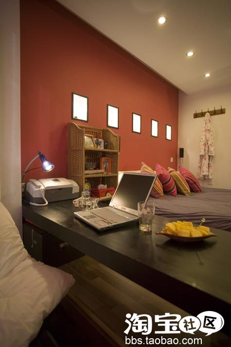 咪咪家的床台高40厘米,在床的靠窗一边设置了一长条书桌,在台上放个软垫就能很舒服地上网。书桌的另一边在床台下,坐上一把平常高度的椅子刚好可以舒服地在书桌上写作。第一次看到的时候真是不禁为这个设计叫绝,既节省空间,又能够让主人随自己喜欢的姿势来使用。(图9)