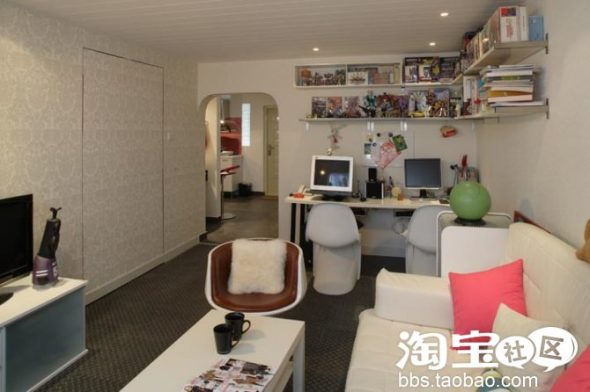 这个独特的案例是为一对年轻的soho人士设计的:男主人是影视制作高手,平时喜欢收藏变形金刚、限量版的可口可乐瓶,以及各种影视海报,还是一个电子乐的爱好者兼DJ;女主人从事动漫设计工作,满墙的娃娃都是她的最爱。