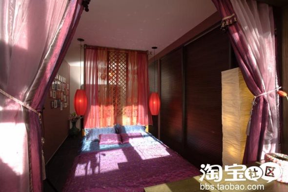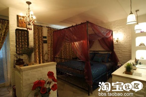 另外,设计师为了分隔功能性分区,保留一定的私密性,在空间当中设置了很多帷幕和纱帘。飘逸的布艺产品不仅分开了各个功能性分区,更给空间平添了不少女性的温柔气息。(图7)